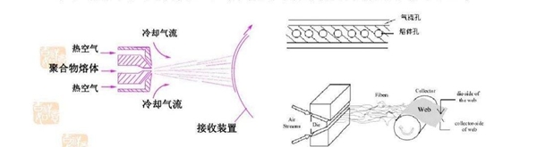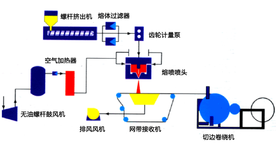 熔噴布的生產(chǎn)工藝是熔噴非織造工藝,利用高速熱空氣對模頭噴絲孔擠出的聚合物熔體細(xì)流進(jìn)行牽伸,由此形成超細(xì)纖維并凝聚在凝網(wǎng)簾或滾筒上,并依靠自身粘合而成為非織造布。